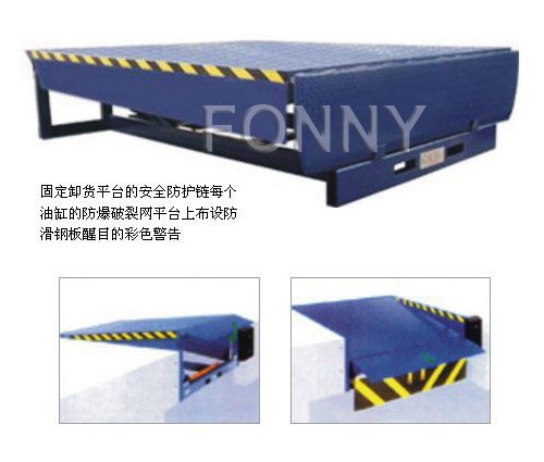 •電控操作極其簡單,只需按動按鈕,調節板會自動升起,松開按鈕,調節板靠自重下降;電源控制箱外置,方便設備維修保養,并帶電鎖;活頁搭板搭在貨車上即可使用。