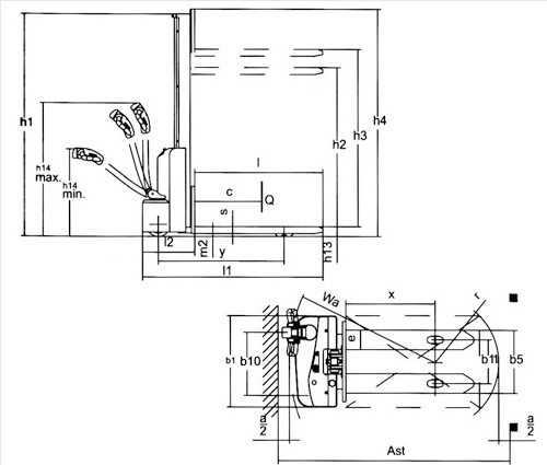 直角堆垛通道寬度,踏板收起/放下(托盤1000×1200,1200沿貨叉放置) |