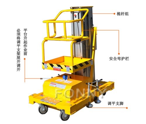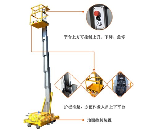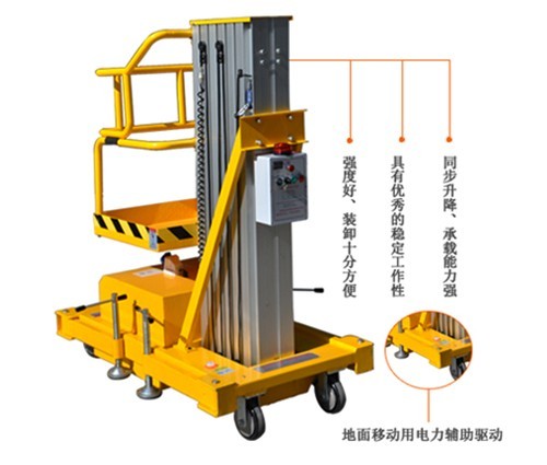 • 升降桅柱全部用高強度鋁合金型材,整機重量輕,移動十分輕便;