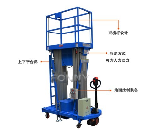 • 兩組桅柱支撐作業平臺同步升降,具有優秀的工作穩定性;整體升降式護欄裝置,強度好;